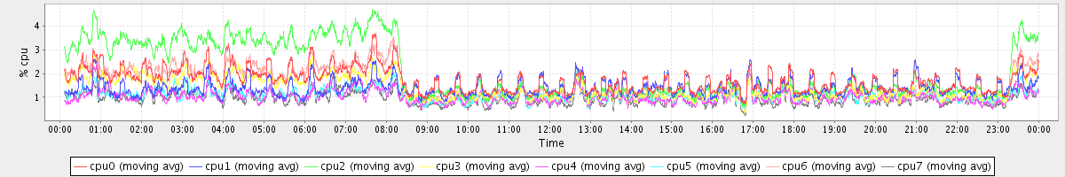 avg(cpu0) = 0.15 avg(cpu1) = 0.01 avg(cpu2) = 0.09 avg(cpu3) = 0.02 avg(cpu4) = 0.00 avg(cpu5) = 0.00 avg(cpu6) = 0.05 avg(cpu7) = 0.00
