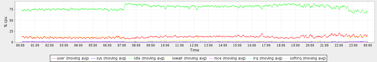avg(user) = 12.18 avg(sys) = 1.23 avg(idle) = 79.99 avg(iowait) = 6.18 avg(nice) = 0.00 avg(irq) = 0.03 avg(softirq) = 0.37