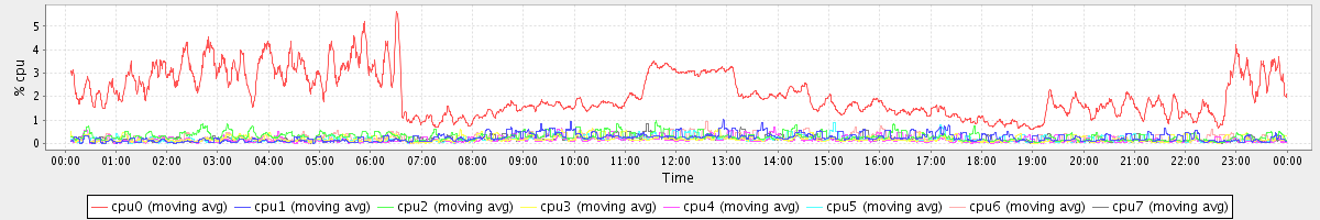 avg(cpu0) = 2.09 avg(cpu1) = 0.25 avg(cpu2) = 0.30 avg(cpu3) = 0.18 avg(cpu4) = 0.14 avg(cpu5) = 0.16 avg(cpu6) = 0.24 avg(cpu7) = 0.16