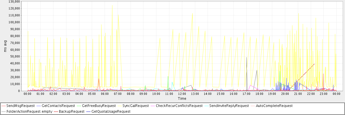 avg(SendMsgRequest) = 904.55 avg(GetContactsRequest) = 1162.25 avg(GetFreeBusyRequest) = 581.59 avg(SyncGalRequest) = 20861.74 avg(CheckRecurConflictsRequest) = 521.32 avg(SendInviteReplyRequest) = 1252.61 avg(AutoCompleteRequest) = 528.62 avg(FolderActionRequest.empty) = 2199.36 avg(BackupRequest) = 19964.50 avg(GetQuotaUsageRequest) = 1926.00