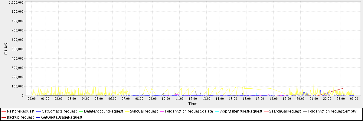 avg(RestoreRequest) = 964231.00 avg(GetContactsRequest) = 3080.50 avg(DeleteAccountRequest) = 2890.00 avg(SyncGalRequest) = 25769.29 avg(FolderActionRequest.delete) = 3157.64 avg(ApplyFilterRulesRequest) = 7091.60 avg(SearchGalRequest) = 1257.58 avg(FolderActionRequest.empty) = 3923.10 avg(BackupRequest) = 42086.50 avg(GetQuotaUsageRequest) = 1260.00