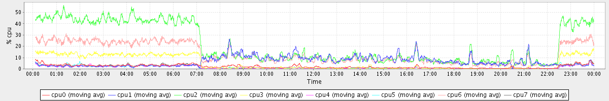 avg(cpu0) = 2.17 avg(cpu1) = 6.48 avg(cpu2) = 21.40 avg(cpu3) = 5.21 avg(cpu4) = 1.28 avg(cpu5) = 1.38 avg(cpu6) = 13.53 avg(cpu7) = 1.53