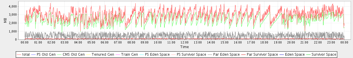 avg(total) = 2976.40 avg(PS Old Gen) = 0.00 avg(CMS Old Gen) = 2404.55 avg(Tenured Gen) = 0.00 avg(Train Gen) = 0.00 avg(PS Eden Space) = 0.00 avg(PS Survivor Space) = 0.00 avg(Par Eden Space) = 481.75 avg(Par Survivor Space) = 90.09 avg(Eden Space) = 0.00 avg(Survivor Space) = 0.00