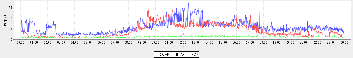 Host zm03.stanford.edu: Mailboxd: Request Rate by Client Protocol