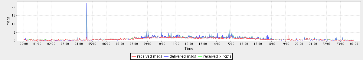 avg(received msgs) = 1.07 avg(delivered msgs) = 1.23 avg(received x rcpts) = 1.31