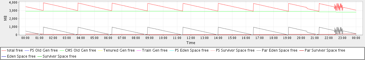 avg(total free) = 3418.09 avg(PS Old Gen free) = 0.00 avg(CMS Old Gen free) = 2882.50 avg(Tenured Gen free) = 0.00 avg(Train Gen free) = 0.00 avg(PS Eden Space free) = 0.00 avg(PS Survivor Space free) = 0.00 avg(Par Eden Space free) = 474.50 avg(Par Survivor Space free) = 61.08 avg(Eden Space free) = 0.00 avg(Survivor Space free) = 0.00