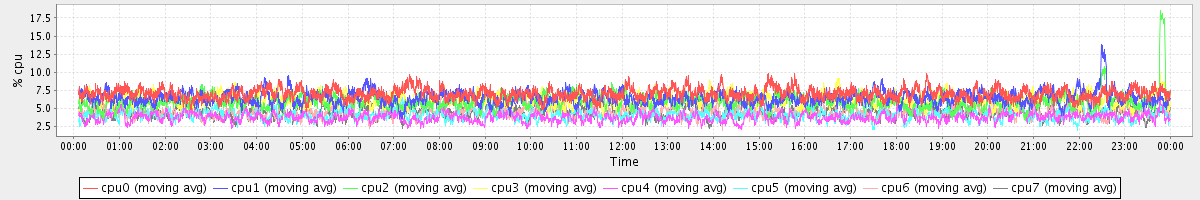 avg(cpu0) = 7.01 avg(cpu1) = 6.45 avg(cpu2) = 5.98 avg(cpu3) = 6.26 avg(cpu4) = 3.79 avg(cpu5) = 4.15 avg(cpu6) = 4.56 avg(cpu7) = 4.52