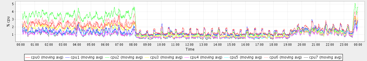 avg(cpu0) = 1.70 avg(cpu1) = 4.44 avg(cpu2) = 17.43 avg(cpu3) = 5.36 avg(cpu4) = 1.31 avg(cpu5) = 1.48 avg(cpu6) = 11.82 avg(cpu7) = 1.62