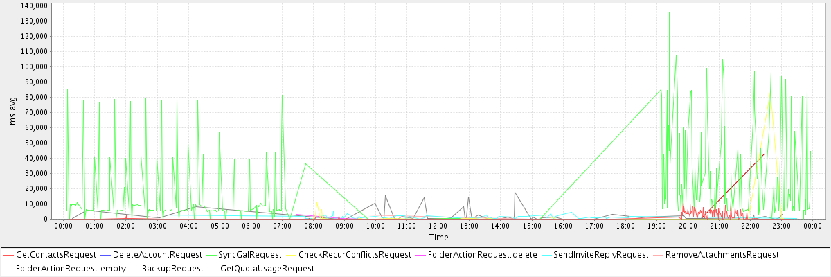 avg(GetContactsRequest) = 982.59 avg(DeleteAccountRequest) = 2715.00 avg(SyncGalRequest) = 19877.38 avg(CheckRecurConflictsRequest) = 2653.83 avg(FolderActionRequest.delete) = 937.50 avg(SendInviteReplyRequest) = 1333.83 avg(RemoveAttachmentsRequest) = 1531.50 avg(FolderActionRequest.empty) = 2439.24 avg(BackupRequest) = 21596.00 avg(GetQuotaUsageRequest) = 1211.00