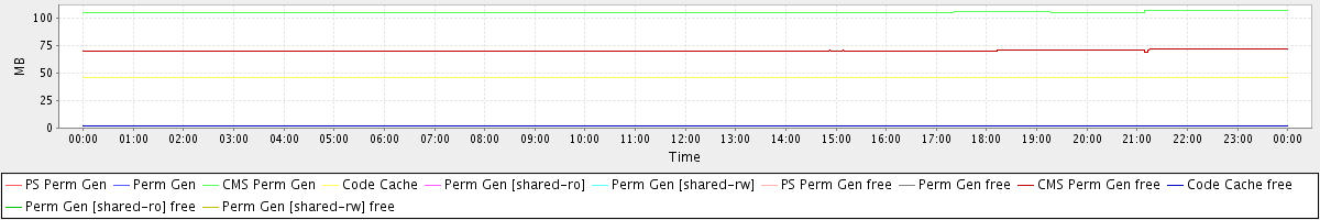 avg(PS Perm Gen) = 0.00 avg(Perm Gen) = 0.00 avg(CMS Perm Gen) = 105.05 avg(Code Cache) = 45.56 avg(Perm Gen [shared-ro]) = 0.00 avg(Perm Gen [shared-rw]) = 0.00 avg(PS Perm Gen free) = 0.00 avg(Perm Gen free) = 0.00 avg(CMS Perm Gen free) = 70.22 avg(Code Cache free) = 2.26 avg(Perm Gen [shared-ro] free) = 0.00 avg(Perm Gen [shared-rw] free) = 0.00