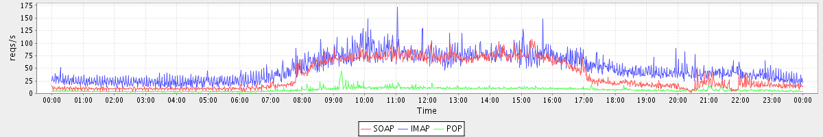 Host zm08.stanford.edu: Mailboxd: Request Rate by Client Protocol
