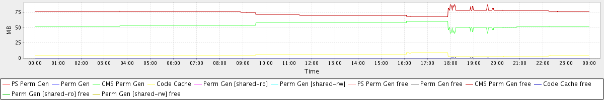 avg(PS Perm Gen) = 0.00 avg(Perm Gen) = 0.00 avg(CMS Perm Gen) = 53.99 avg(Code Cache) = 5.32 avg(Perm Gen [shared-ro]) = 0.00 avg(Perm Gen [shared-rw]) = 0.00 avg(PS Perm Gen free) = 0.00 avg(Perm Gen free) = 0.00 avg(CMS Perm Gen free) = 74.01 avg(Code Cache free) = 0.15 avg(Perm Gen [shared-ro] free) = 0.00 avg(Perm Gen [shared-rw] free) = 0.00