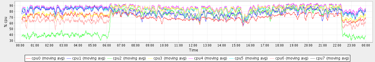 avg(cpu0) = 70.85 avg(cpu1) = 78.86 avg(cpu2) = 65.12 avg(cpu3) = 81.18 avg(cpu4) = 86.87 avg(cpu5) = 84.34 avg(cpu6) = 73.38 avg(cpu7) = 84.44