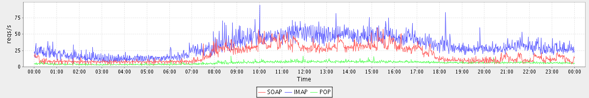 Host zm01.stanford.edu: Mailboxd: Request Rate by Client Protocol