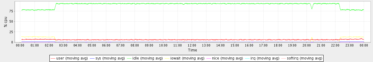 avg(user) = 6.29 avg(sys) = 0.71 avg(idle) = 90.53 avg(iowait) = 2.45 avg(nice) = 0.00 avg(irq) = 0.00 avg(softirq) = 0.02