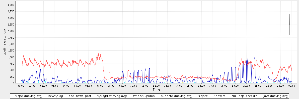 avg(slapd) = 466.02 avg(newsyslog) = 2312.80 avg(ood-news-post) = 11.00 avg(syslogd) = 11.20 avg(zmbackupldap) = 5.00 avg(puppetd) = 11.67 avg(slapcat) = 185.00 avg(tripwire) = 2241.00 avg(zm-ldap-checkre) = 5.50 avg(java) = 136.86
