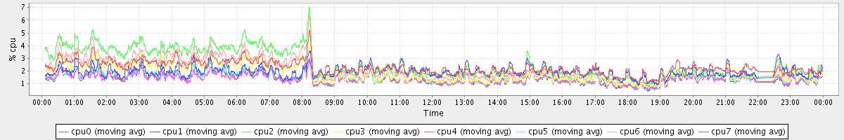 avg(cpu0) = 3.11 avg(cpu1) = 0.36 avg(cpu2) = 0.44 avg(cpu3) = 0.32 avg(cpu4) = 0.27 avg(cpu5) = 0.27 avg(cpu6) = 0.35 avg(cpu7) = 0.29