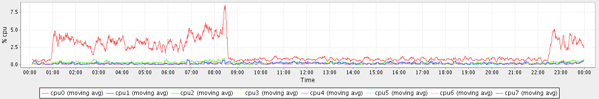 avg(cpu0) = 1.76 avg(cpu1) = 0.18 avg(cpu2) = 0.24 avg(cpu3) = 0.16 avg(cpu4) = 0.11 avg(cpu5) = 0.11 avg(cpu6) = 0.18 avg(cpu7) = 0.12