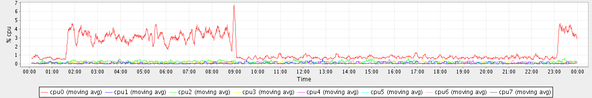 avg(cpu0) = 1.61 avg(cpu1) = 0.09 avg(cpu2) = 0.19 avg(cpu3) = 0.10 avg(cpu4) = 0.06 avg(cpu5) = 0.07 avg(cpu6) = 0.11 avg(cpu7) = 0.06