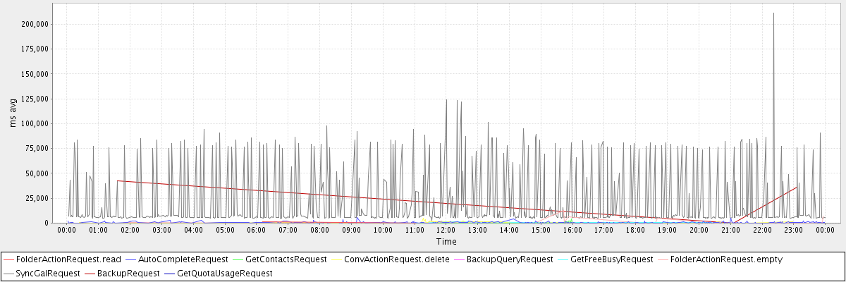 avg(FolderActionRequest.read) = 653.00 avg(AutoCompleteRequest) = 615.05 avg(GetContactsRequest) = 728.42 avg(ConvActionRequest.delete) = 996.69 avg(BackupQueryRequest) = 335.75 avg(GetFreeBusyRequest) = 560.83 avg(FolderActionRequest.empty) = 1557.47 avg(SyncGalRequest) = 21089.68 avg(BackupRequest) = 26141.00 avg(GetQuotaUsageRequest) = 1178.00