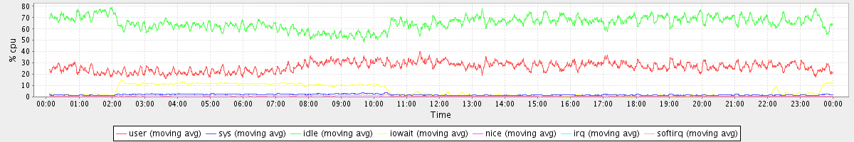 avg(user) = 26.60 avg(sys) = 1.86 avg(idle) = 65.43 avg(iowait) = 5.24 avg(nice) = 0.00 avg(irq) = 0.09 avg(softirq) = 0.78