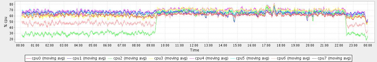avg(cpu0) = 61.36 avg(cpu1) = 65.08 avg(cpu2) = 49.11 avg(cpu3) = 65.31 avg(cpu4) = 68.95 avg(cpu5) = 67.12 avg(cpu6) = 55.46 avg(cpu7) = 64.53