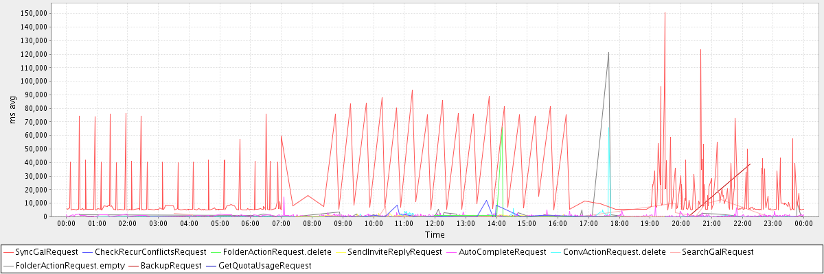 avg(SyncGalRequest) = 17008.35 avg(CheckRecurConflictsRequest) = 1431.88 avg(FolderActionRequest.delete) = 8492.88 avg(SendInviteReplyRequest) = 469.82 avg(AutoCompleteRequest) = 647.43 avg(ConvActionRequest.delete) = 1140.44 avg(SearchGalRequest) = 1027.68 avg(FolderActionRequest.empty) = 2959.75 avg(BackupRequest) = 19649.00 avg(GetQuotaUsageRequest) = 1102.00