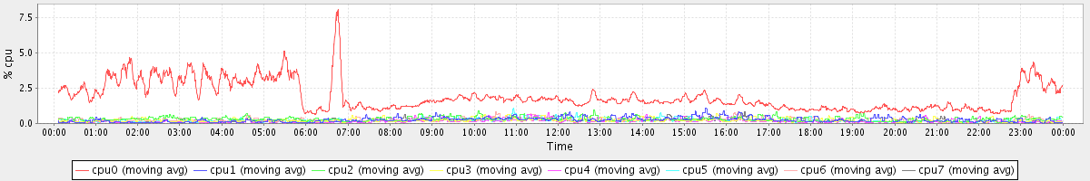 avg(cpu0) = 1.90 avg(cpu1) = 0.25 avg(cpu2) = 0.32 avg(cpu3) = 0.21 avg(cpu4) = 0.16 avg(cpu5) = 0.19 avg(cpu6) = 0.25 avg(cpu7) = 0.18