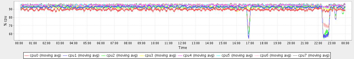 avg(cpu0) = 89.59 avg(cpu1) = 91.60 avg(cpu2) = 91.53 avg(cpu3) = 92.36 avg(cpu4) = 94.64 avg(cpu5) = 94.58 avg(cpu6) = 94.44 avg(cpu7) = 95.10
