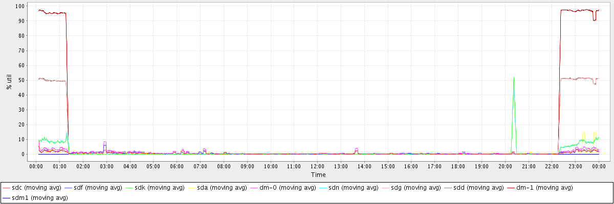 avg(sdc) = 0.53 avg(sdf) = 0.56 avg(sdk) = 1.27 avg(sda) = 1.17 avg(dm-0) = 0.98 avg(sdn) = 1.28 avg(sdg) = 6.32 avg(sdd) = 6.32 avg(dm-1) = 12.05 avg(sdm1) = 0.00
