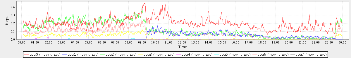 avg(cpu0) = 0.20 avg(cpu1) = 0.03 avg(cpu2) = 0.12 avg(cpu3) = 0.03 avg(cpu4) = 0.00 avg(cpu5) = 0.00 avg(cpu6) = 0.08 avg(cpu7) = 0.00