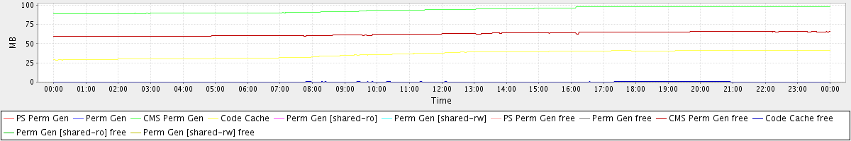 avg(PS Perm Gen) = 0.00 avg(Perm Gen) = 0.00 avg(CMS Perm Gen) = 93.97 avg(Code Cache) = 36.32 avg(Perm Gen [shared-ro]) = 0.00 avg(Perm Gen [shared-rw]) = 0.00 avg(PS Perm Gen free) = 0.00 avg(Perm Gen free) = 0.00 avg(CMS Perm Gen free) = 62.64 avg(Code Cache free) = 0.37 avg(Perm Gen [shared-ro] free) = 0.00 avg(Perm Gen [shared-rw] free) = 0.00
