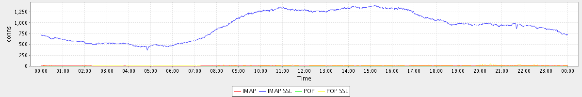 avg(IMAP) = 11.99 avg(IMAP SSL) = 939.40 avg(POP) = 0.38 avg(POP SSL) = 14.54