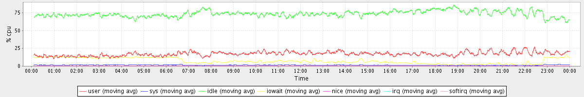 avg(user) = 17.25 avg(sys) = 1.48 avg(idle) = 73.53 avg(iowait) = 7.24 avg(nice) = 0.00 avg(irq) = 0.05 avg(softirq) = 0.45