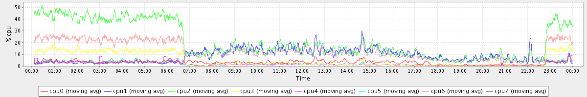 avg(cpu0) = 3.13 avg(cpu1) = 8.45 avg(cpu2) = 21.14 avg(cpu3) = 5.30 avg(cpu4) = 1.77 avg(cpu5) = 2.17 avg(cpu6) = 13.79 avg(cpu7) = 2.15