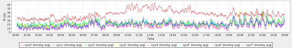avg(cpu0) = 28.21 avg(cpu1) = 15.10 avg(cpu2) = 16.42 avg(cpu3) = 15.28 avg(cpu4) = 13.17 avg(cpu5) = 16.51 avg(cpu6) = 16.67 avg(cpu7) = 16.66