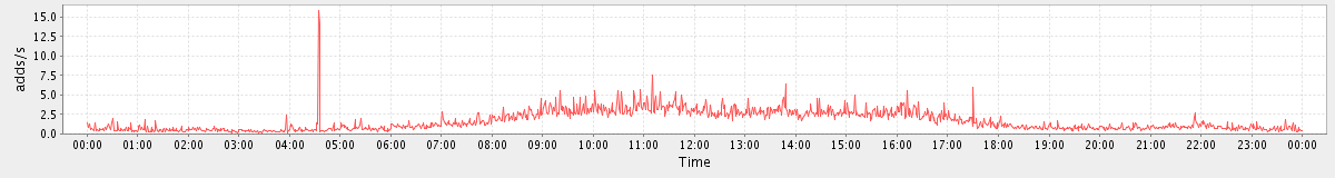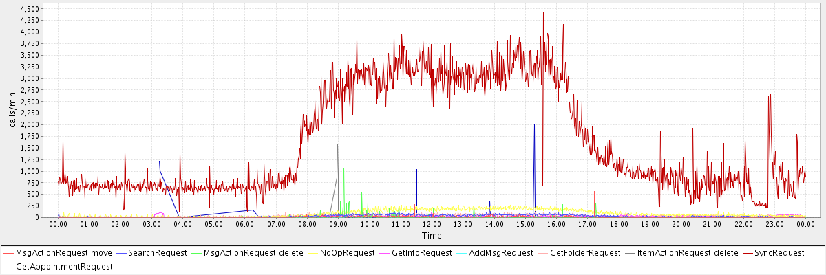 max(MsgActionRequest.move) = 567.00 max(SearchRequest) = 125.00 max(MsgActionRequest.delete) = 1070.00 max(NoOpRequest) = 265.00 max(GetInfoRequest) = 112.00 max(AddMsgRequest) = 117.00 max(GetFolderRequest) = 120.00 max(ItemActionRequest.delete) = 1578.00 max(SyncRequest) = 4412.00 max(GetAppointmentRequest) = 2019.00