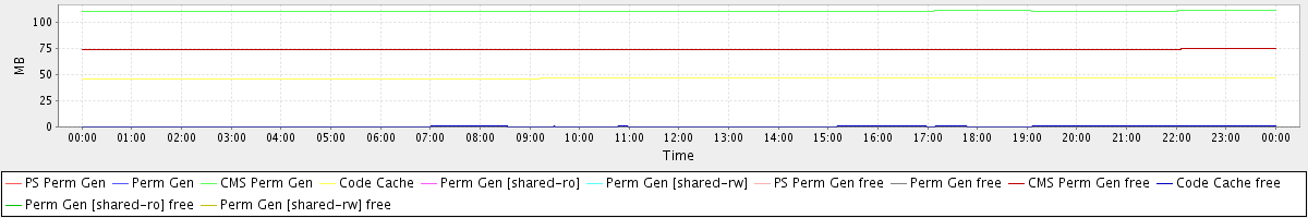 avg(PS Perm Gen) = 0.00 avg(Perm Gen) = 0.00 avg(CMS Perm Gen) = 110.96 avg(Code Cache) = 46.63 avg(Perm Gen [shared-ro]) = 0.00 avg(Perm Gen [shared-rw]) = 0.00 avg(PS Perm Gen free) = 0.00 avg(Perm Gen free) = 0.00 avg(CMS Perm Gen free) = 74.13 avg(Code Cache free) = 0.47 avg(Perm Gen [shared-ro] free) = 0.00 avg(Perm Gen [shared-rw] free) = 0.00