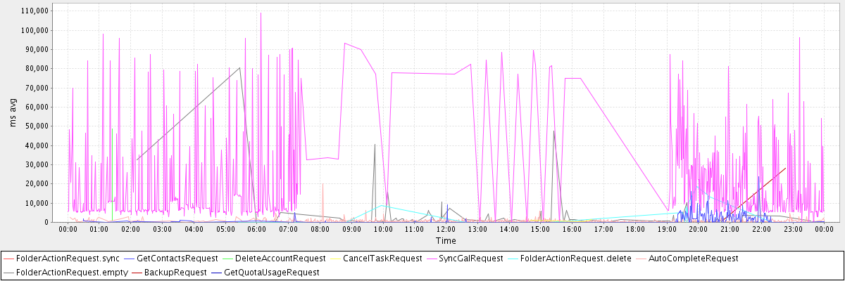 avg(FolderActionRequest.sync) = 44160.00 avg(GetContactsRequest) = 1157.48 avg(DeleteAccountRequest) = 24845.50 avg(CancelTaskRequest) = 741.25 avg(SyncGalRequest) = 20636.01 avg(FolderActionRequest.delete) = 4353.47 avg(AutoCompleteRequest) = 780.08 avg(FolderActionRequest.empty) = 3810.66 avg(BackupRequest) = 14501.50 avg(GetQuotaUsageRequest) = 1197.00
