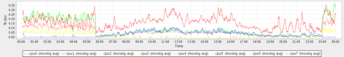 avg(cpu0) = 1.95 avg(cpu1) = 0.25 avg(cpu2) = 0.34 avg(cpu3) = 0.23 avg(cpu4) = 0.15 avg(cpu5) = 0.19 avg(cpu6) = 0.25 avg(cpu7) = 0.17