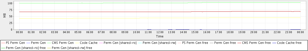 avg(PS Perm Gen) = 0.00 avg(Perm Gen) = 0.00 avg(CMS Perm Gen) = 101.99 avg(Code Cache) = 44.16 avg(Perm Gen [shared-ro]) = 0.00 avg(Perm Gen [shared-rw]) = 0.00 avg(PS Perm Gen free) = 0.00 avg(Perm Gen free) = 0.00 avg(CMS Perm Gen free) = 68.08 avg(Code Cache free) = 0.36 avg(Perm Gen [shared-ro] free) = 0.00 avg(Perm Gen [shared-rw] free) = 0.00
