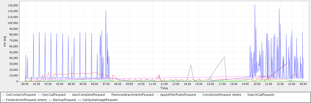 avg(GetContactsRequest) = 2054.89 avg(SyncGalRequest) = 16238.25 avg(AutoCompleteRequest) = 620.45 avg(RemoveAttachmentsRequest) = 651.50 avg(ApplyFilterRulesRequest) = 5978.50 avg(ConvActionRequest.delete) = 730.68 avg(SearchGalRequest) = 427.91 avg(FolderActionRequest.empty) = 3026.70 avg(BackupRequest) = 15725.50 avg(GetQuotaUsageRequest) = 1269.00