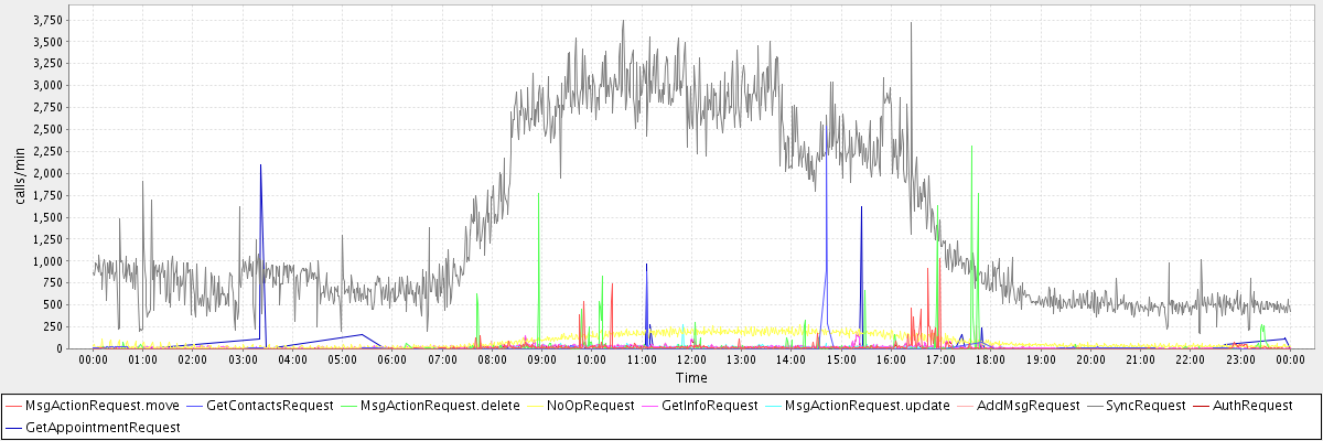 max(MsgActionRequest.move) = 1026.00 max(GetContactsRequest) = 2534.00 max(MsgActionRequest.delete) = 2311.00 max(NoOpRequest) = 275.00 max(GetInfoRequest) = 184.00 max(MsgActionRequest.update) = 279.00 max(AddMsgRequest) = 266.00 max(SyncRequest) = 3739.00 max(AuthRequest) = 179.00 max(GetAppointmentRequest) = 2104.00