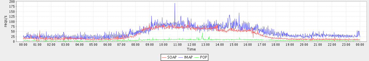Host zm08.stanford.edu: Mailboxd: Request Rate by Client Protocol