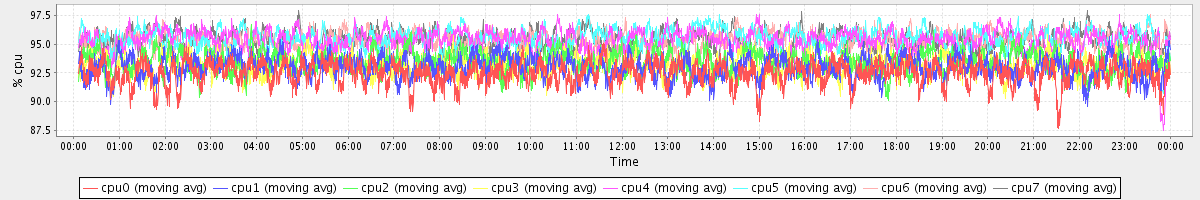 avg(cpu0) = 92.46 avg(cpu1) = 93.00 avg(cpu2) = 93.50 avg(cpu3) = 93.14 avg(cpu4) = 95.40 avg(cpu5) = 95.54 avg(cpu6) = 95.26 avg(cpu7) = 95.37