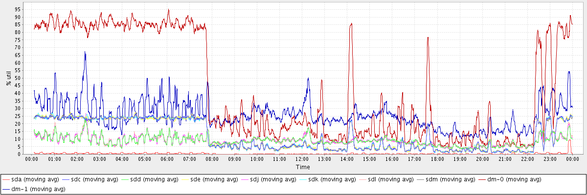 avg(sda) = 0.42 avg(sdc) = 11.80 avg(sdd) = 8.87 avg(sde) = 11.81 avg(sdj) = 8.95 avg(sdk) = 11.84 avg(sdl) = 8.92 avg(sdm) = 11.76 avg(dm-0) = 42.60 avg(dm-1) = 25.91