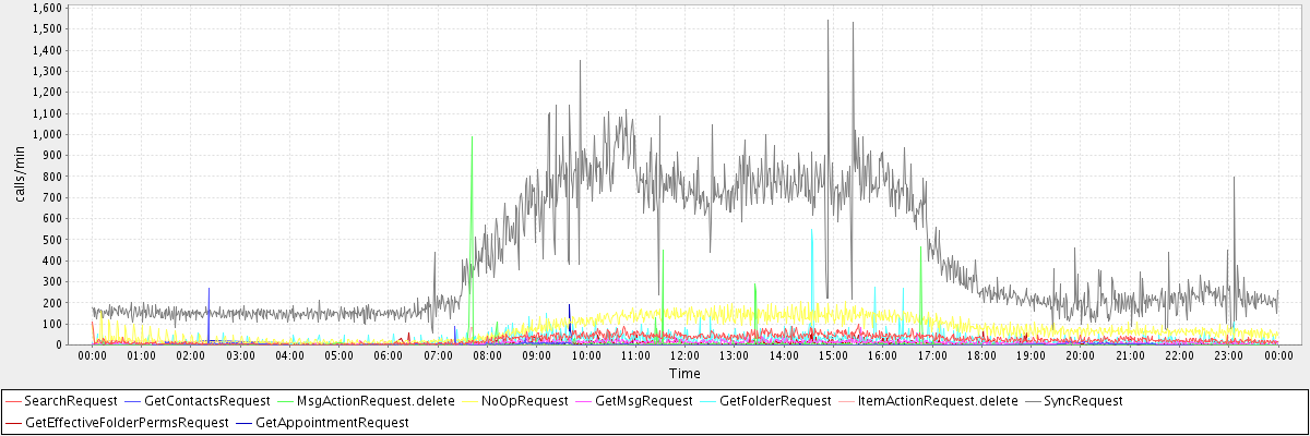 max(SearchRequest) = 107.00 max(GetContactsRequest) = 271.00 max(MsgActionRequest.delete) = 988.00 max(NoOpRequest) = 208.00 max(GetMsgRequest) = 83.00 max(GetFolderRequest) = 547.00 max(ItemActionRequest.delete) = 85.00 max(SyncRequest) = 1541.00 max(GetEffectiveFolderPermsRequest) = 86.00 max(GetAppointmentRequest) = 193.00
