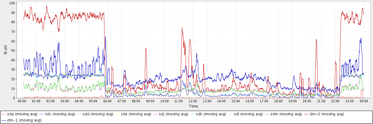avg(sda) = 0.39 avg(sdc) = 9.82 avg(sdd) = 7.76 avg(sde) = 9.75 avg(sdj) = 7.74 avg(sdk) = 9.82 avg(sdl) = 7.83 avg(sdm) = 9.80 avg(dm-0) = 35.45 avg(dm-1) = 22.53