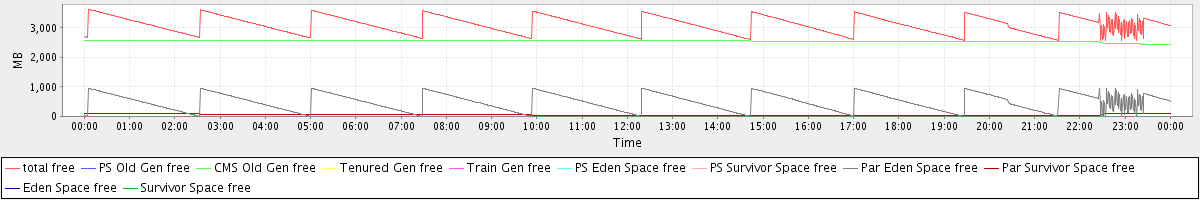 avg(total free) = 3104.82 avg(PS Old Gen free) = 0.00 avg(CMS Old Gen free) = 2551.22 avg(Tenured Gen free) = 0.00 avg(Train Gen free) = 0.00 avg(PS Eden Space free) = 0.00 avg(PS Survivor Space free) = 0.00 avg(Par Eden Space free) = 491.31 avg(Par Survivor Space free) = 62.28 avg(Eden Space free) = 0.00 avg(Survivor Space free) = 0.00