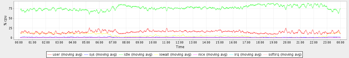 avg(user) = 14.84 avg(sys) = 1.49 avg(idle) = 77.06 avg(iowait) = 6.13 avg(nice) = 0.00 avg(irq) = 0.04 avg(softirq) = 0.44